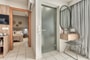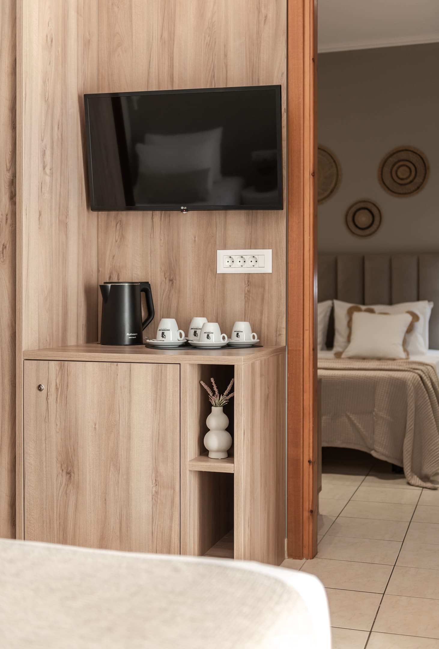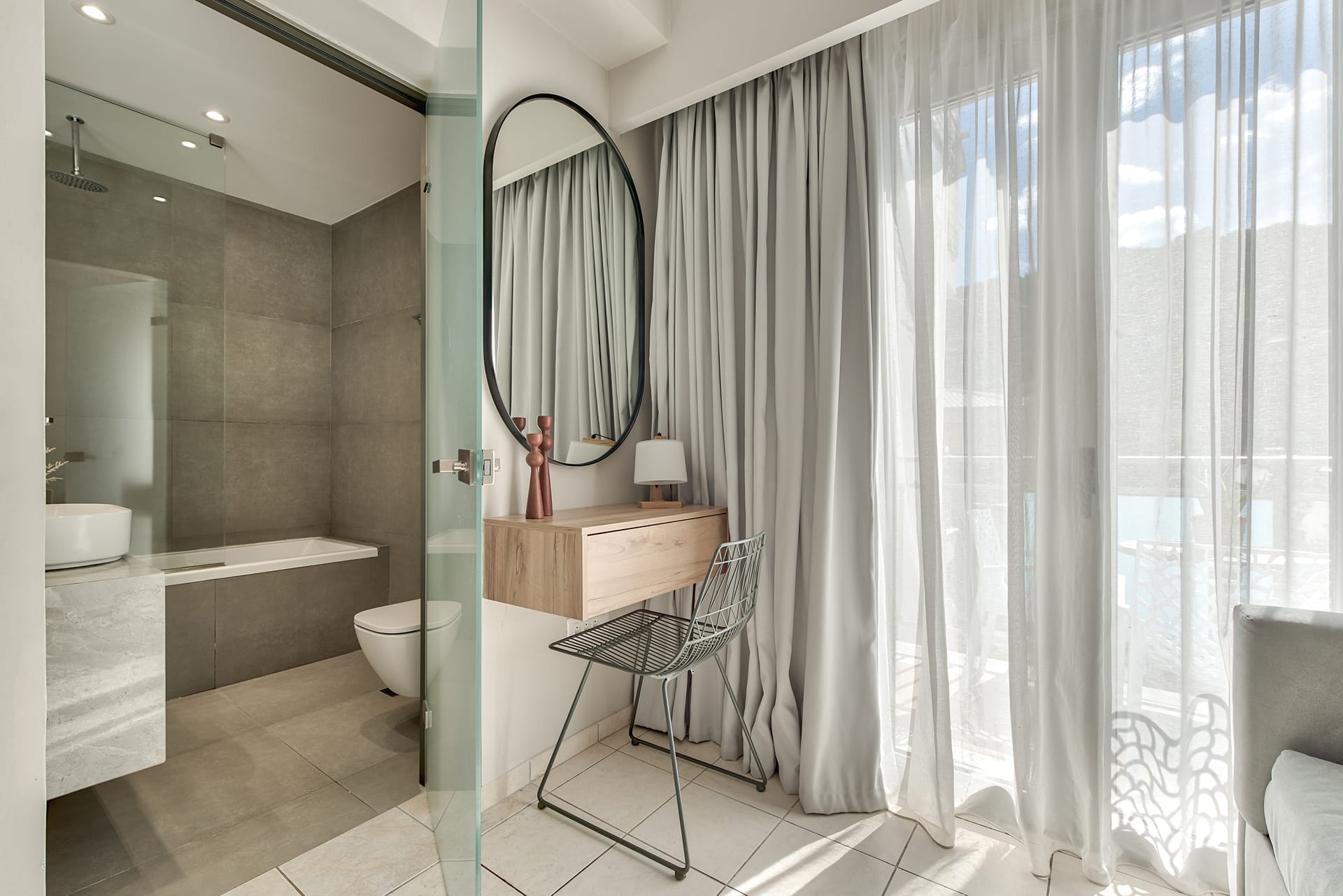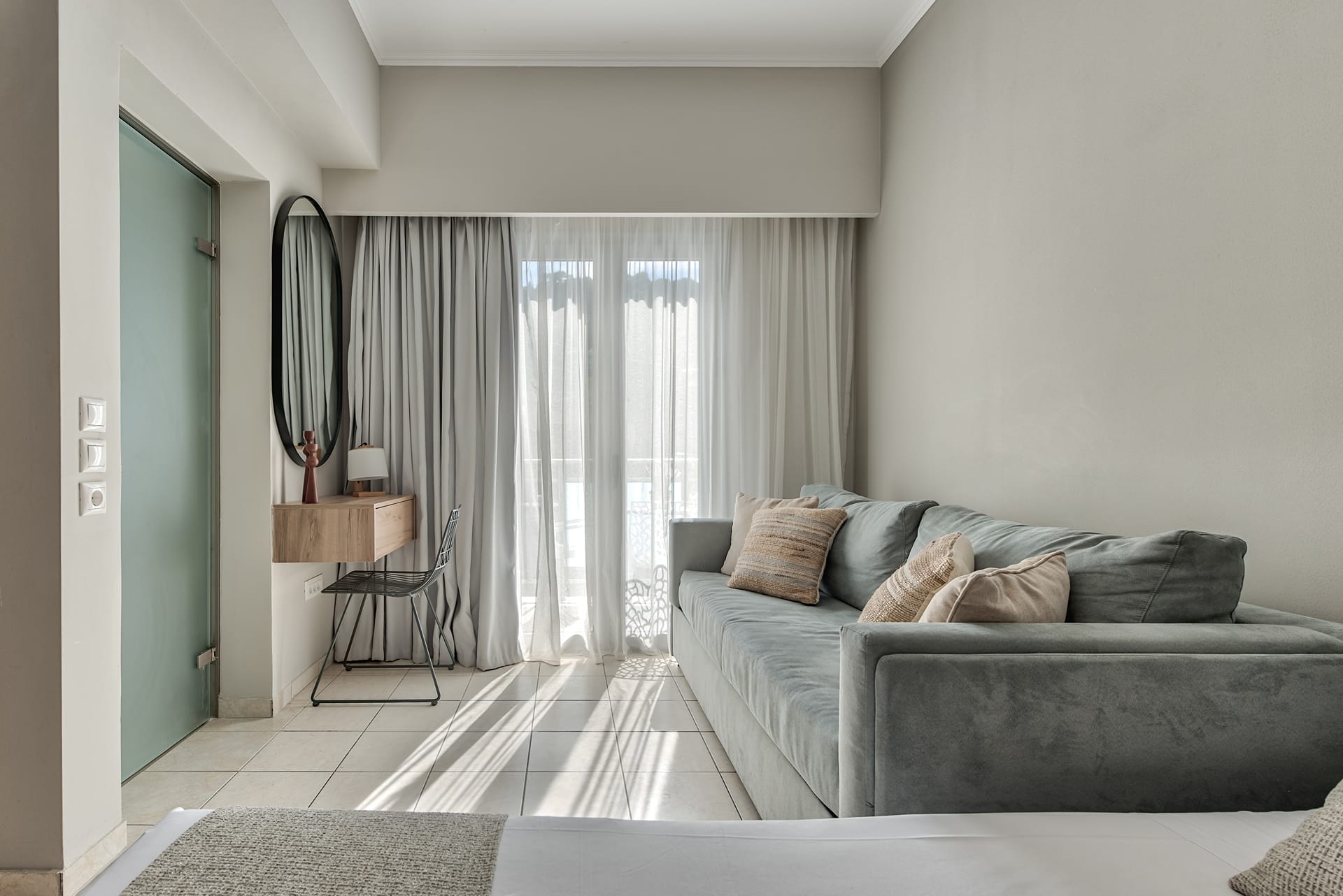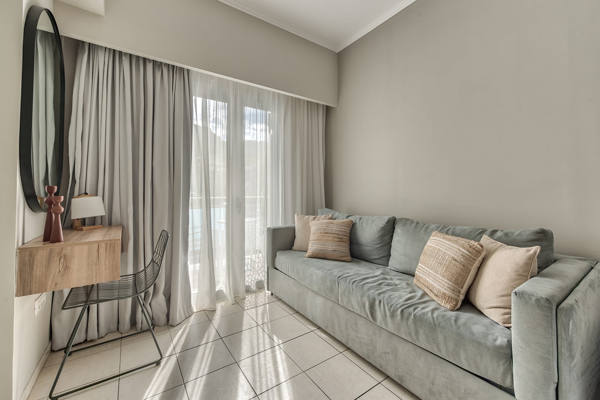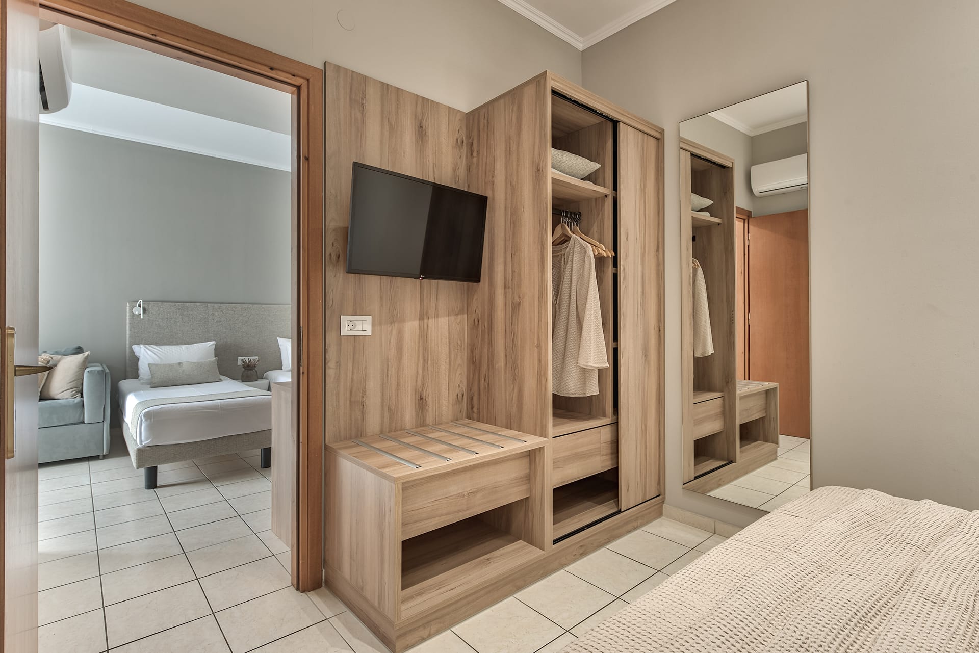 The Interconnecting room of Contessa hotel has 2 rooms with a common entrance and is located on the third floor . The first room has 2 single beds and a sofa bed with its own bathroom with bathtub, TV, mini fridge, safe deposit box and A/C.