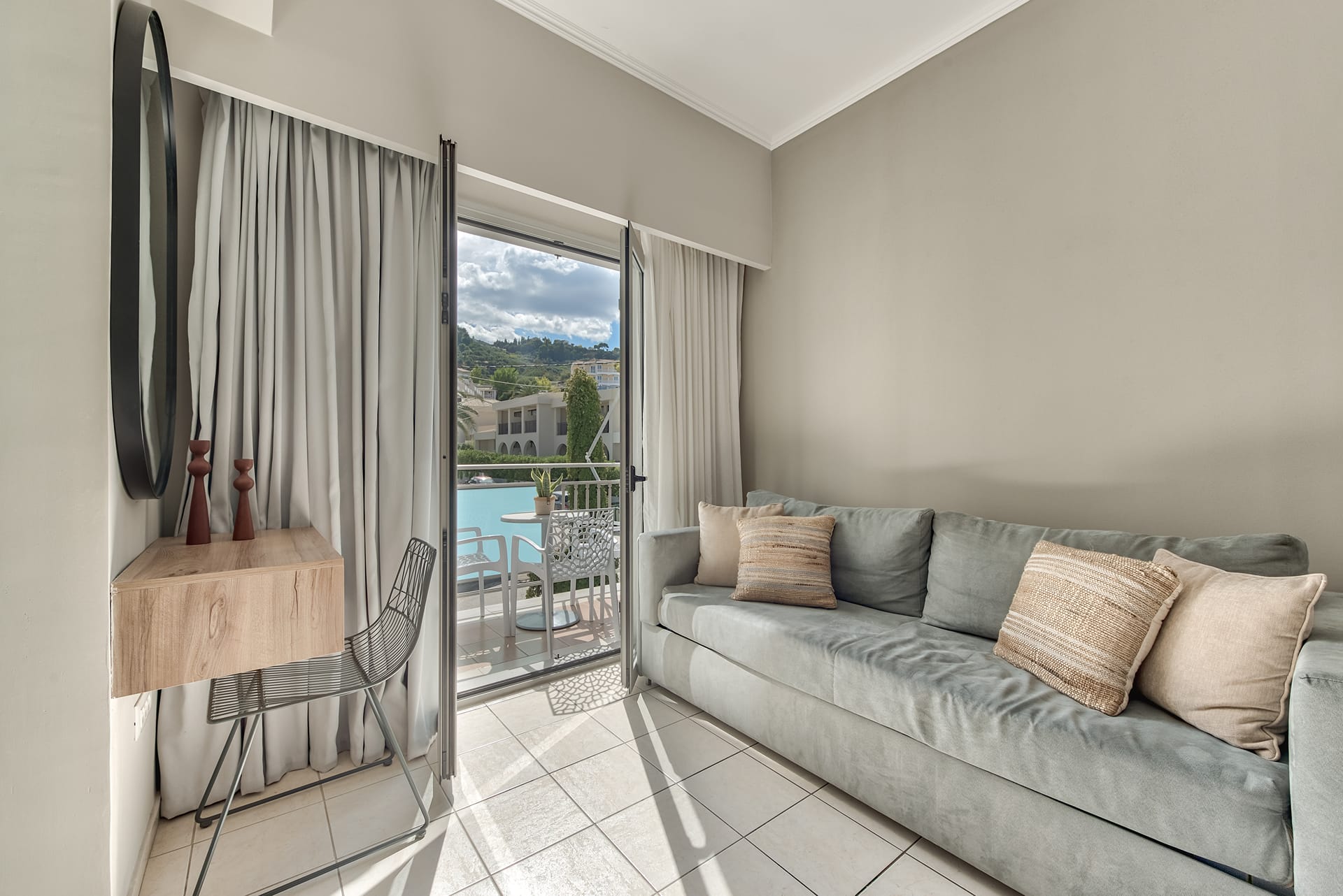 It is about 37 square meters and it has one private balcony with a view of the mountain.