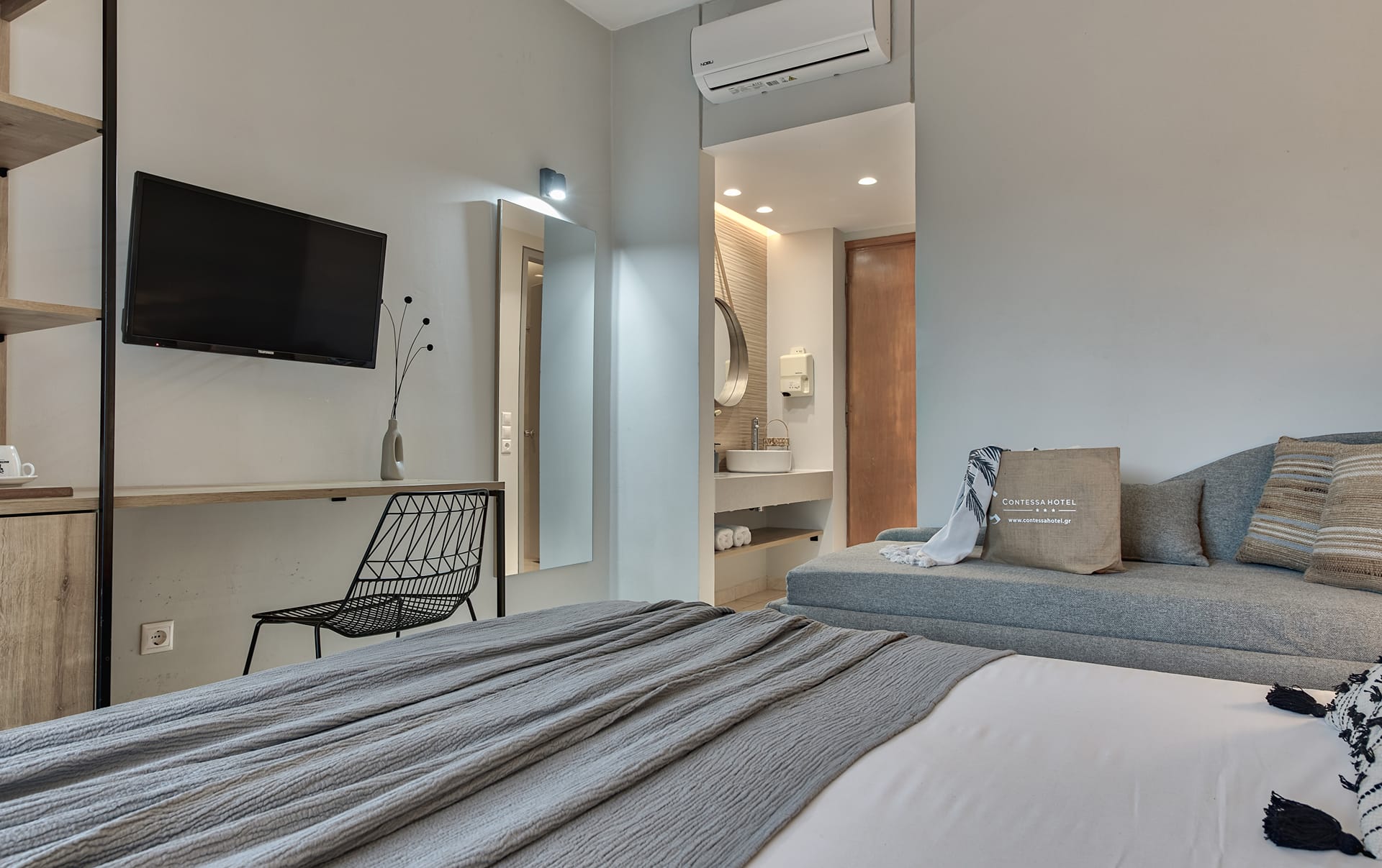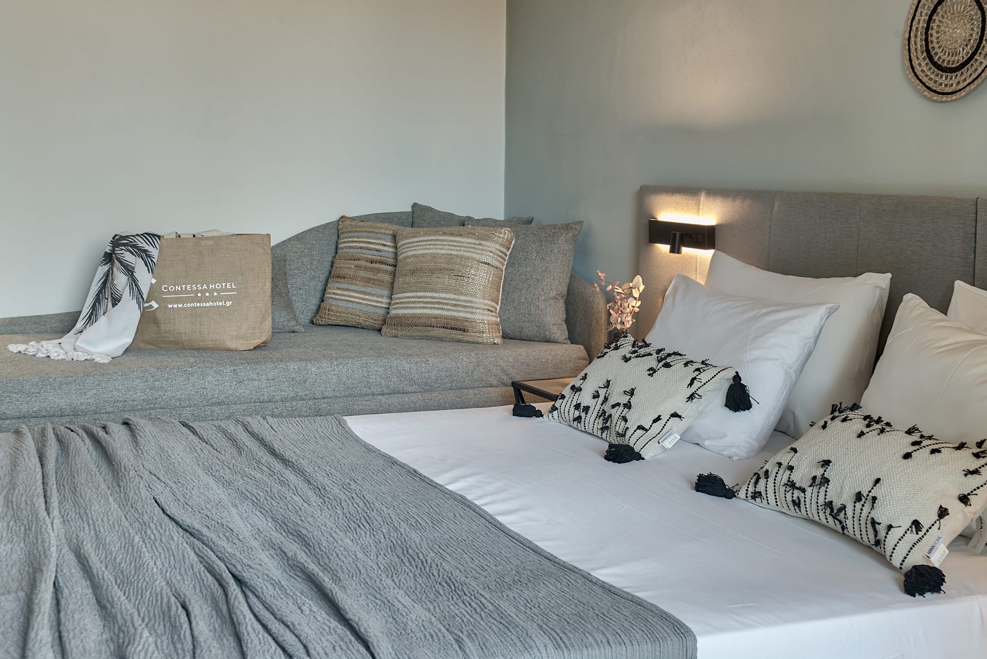 The Premium Double Pool or Sea View rooms of Contessa hotel have a double bed or 2 single beds (upon availability or request).